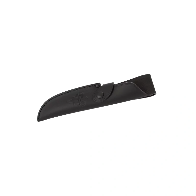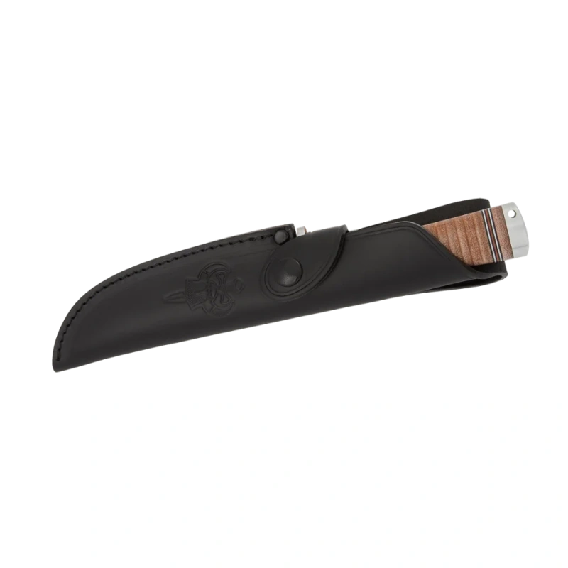 Virnastatud härjanahast käepide tagab kindla ja mugava haarde ning aja jooksul tekib sellele kaunis patina. Nahk on vastupidav õlile, veele ja lahustitele. Roostevabast terasest sõrmekaitse lisab ohutust ning kvaliteetne nahast tupp täiendab komplekti.